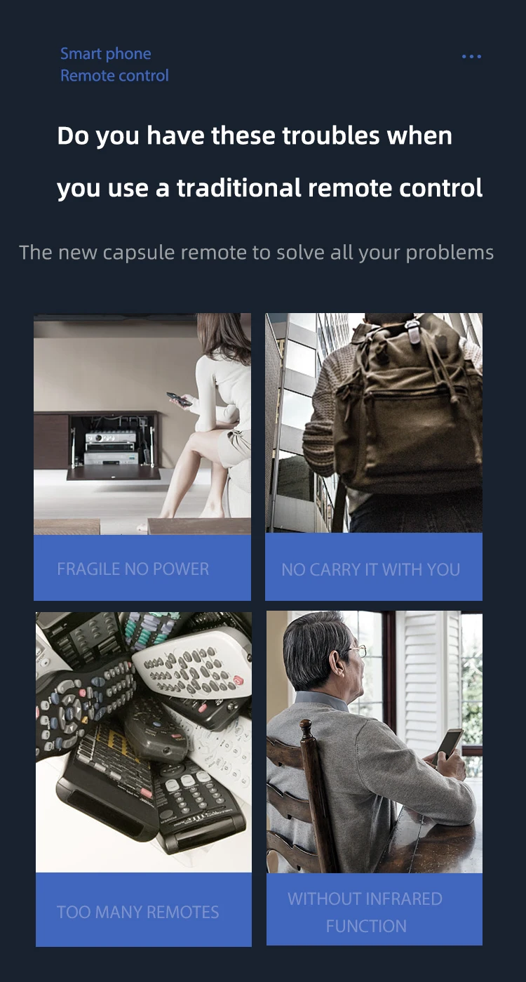 1.【Mobile APP Control】The mobile phone only needs to download an APP, plug in the capsule universal remote control, and the mobile phone becomes a smart remote control in seconds, and it is easy to remotely control the air conditioner TV set-top box projector.